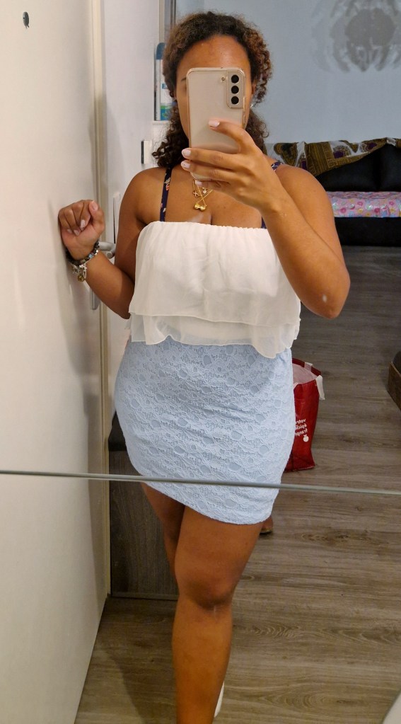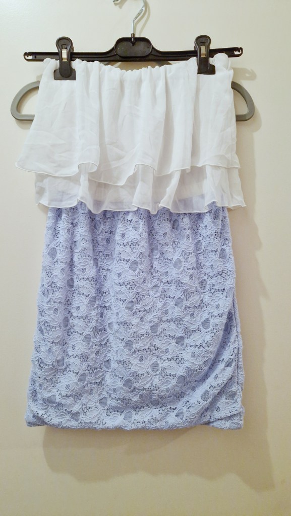 J’ai également trouvé une robe de la marque Resexxy. Elle est blanche et bleue avec du voile et de la dentelle. Cette fois encore c’est une robe élastique.