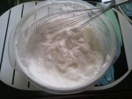 Le lendemain, je me lève, un peu tard… Mais il me reste quand même une bonne partie de l’après midi. Je me lance « battre les blancs en neige » – pouah de la rigolade! Pour l’instant c’est pas dur! Je pars donc à la recherche du fouet électrique. Du fouet électrique…*cogite* En fait je n’ai pas de fouet électrique dans ce petit appart… Il est chez mes parents — » J’entreprends donc de battre les blancs à la mano comme les vrais custo avec mon fouet manuel? Je bats, je bats, crampe de bras droit, je change de bras, je bats, je bats, je rechange de bras. 10minutes plus tard j’ai des beaux blancs, je suis contente ^w^; et comme une quiche, je décide de les mettre au frai pour pas qu’il retombe. Erreur fatale! Le temps que je prépare la pate à macarons, qui semblait un peu trop liquide à mon gout, les blancs qui étaient dans le frigo étaient descendu et avaient repris leur forme initiale, c’est à dire liquide =_= Bon, je sais maintenant que les blancs ne sont pas fait pour être mis au frigo. Ce n’est pas comme la crème chantilly…