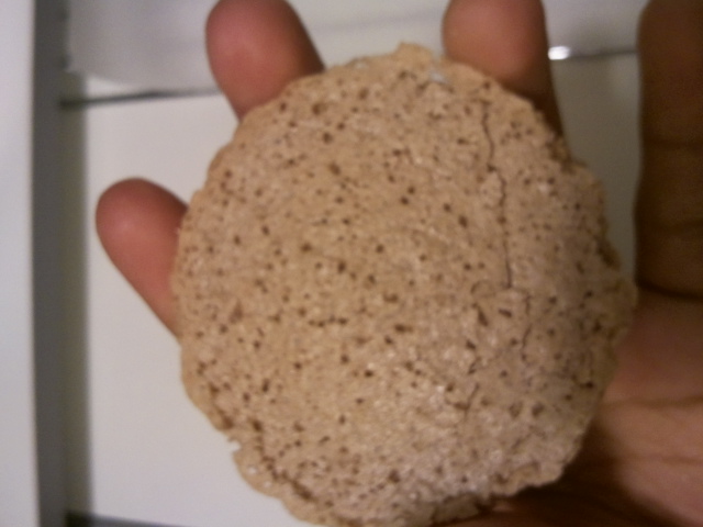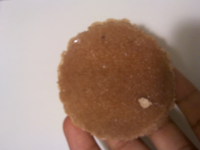 Puis, j’enfourne le tout. Et c’est reparti pour 15/20min d’attente! Quelques minutes plus tard, ce n’est pas concluant é_è Ca n’a pas monté. Mais pourquoi? Grrr $@#%! Peut être le four? Je n’ai pas de vrai four. J’ai un mini four pour faire cuire un poulet ou des croissants. Vraiment petit. Mais c’était peut être un  soucis de pâte aussi… les moules aussi? Peut être que c’était un tout. Bref, quoiqu’il en soit, j’ai remis à chauffer, ça a durci puis ça a donné ça: