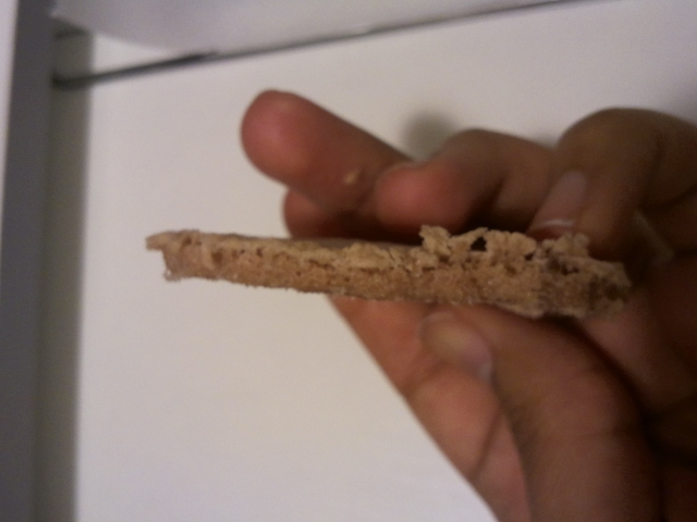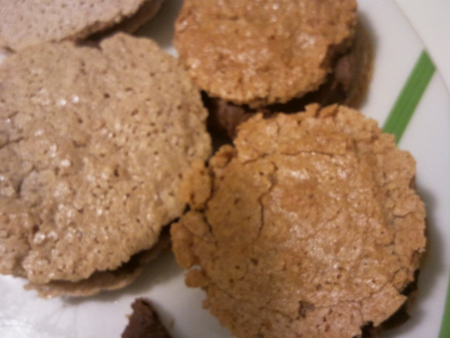 En conclusion, je crois que je ne suis pas faite pour la cuisine =_= Ils avaient bien dit que c’était pas simple. Pourquoi j’ai absolument voulu tester les macarons et pas un gâteau basique? La prochaine fois, je tente avec un vrai four et une autre recette… Je ne sais pas où, j’ai foiré mais c’était plutot frustrant… Une journée pour ça… Mis à part ça, c’était quand même mangeable et c’était plutot bon. On aurait dit des sablés, en plus fondant et collant, (vu la quantité d’amande en même temps…) fourré au chocolat. J’aurais bien rajouté du sucre à la ganache mais avec les coques ça aurait du compenser. Enfin bon, je ne m’avoue pas vaincu. La prochaine fois, je ferais mieux \o/