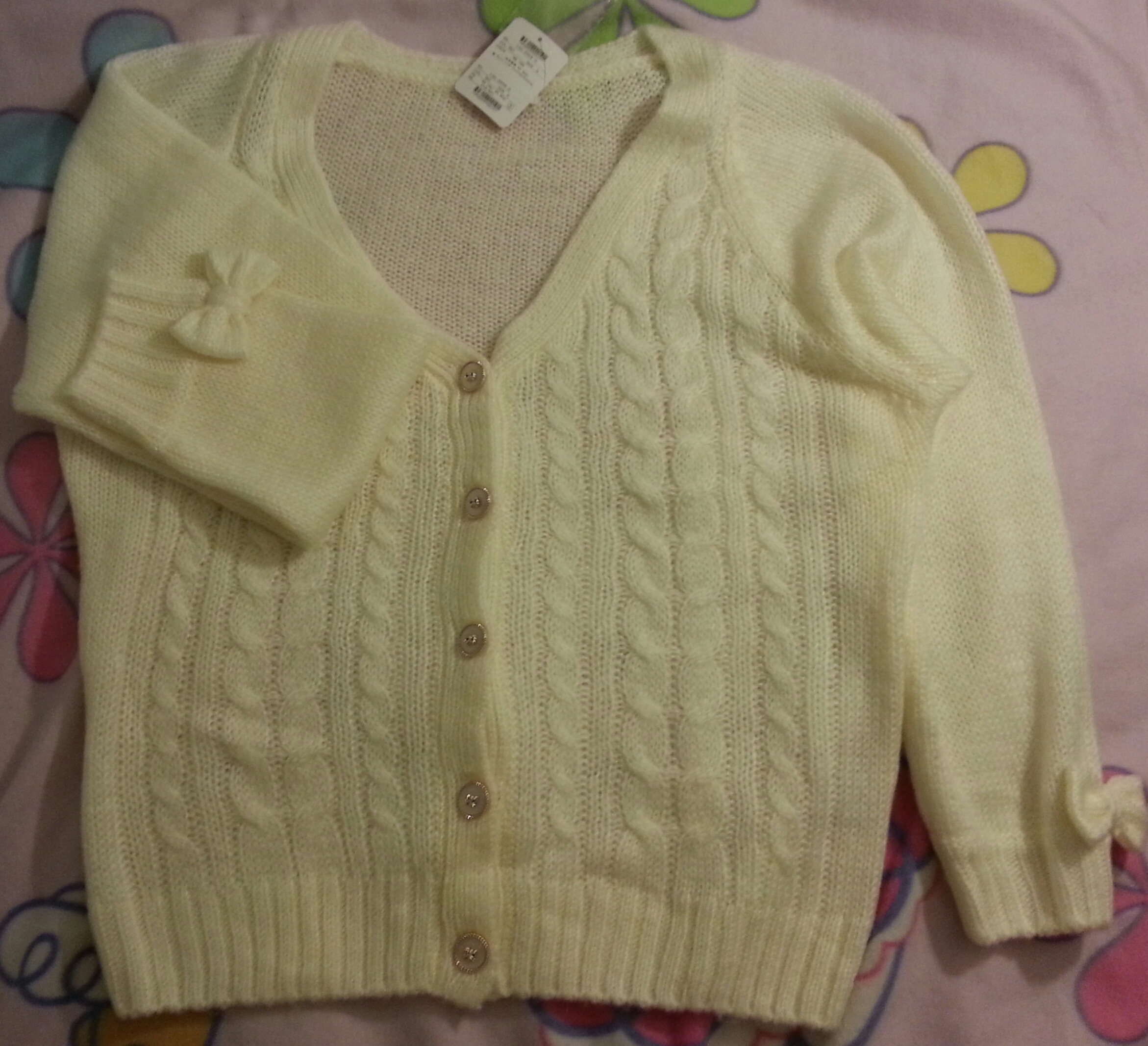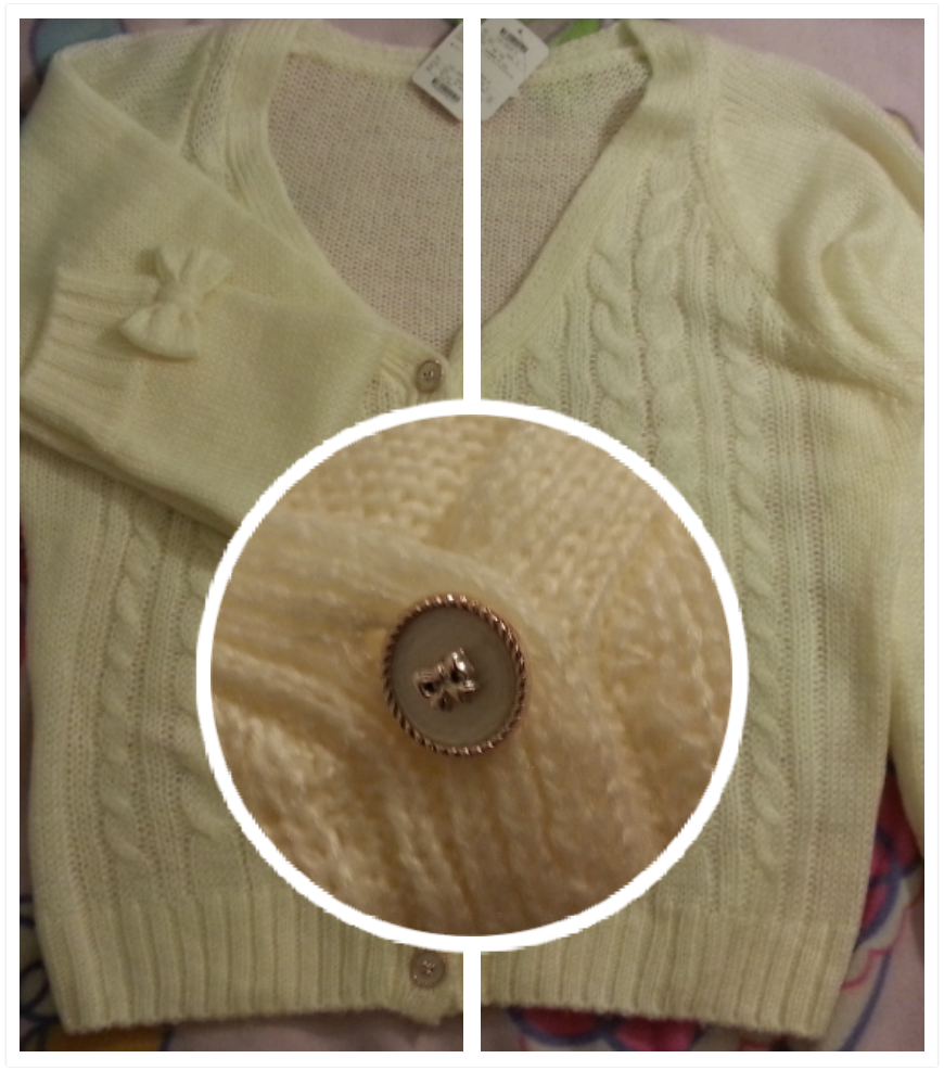 Le pull a l’air un peu plus joli avec les boutons avec motifs nœuds papillon. Puis il est vraiment tout doux et plutôt large du coup on est plutôt à l’aise dedans.
