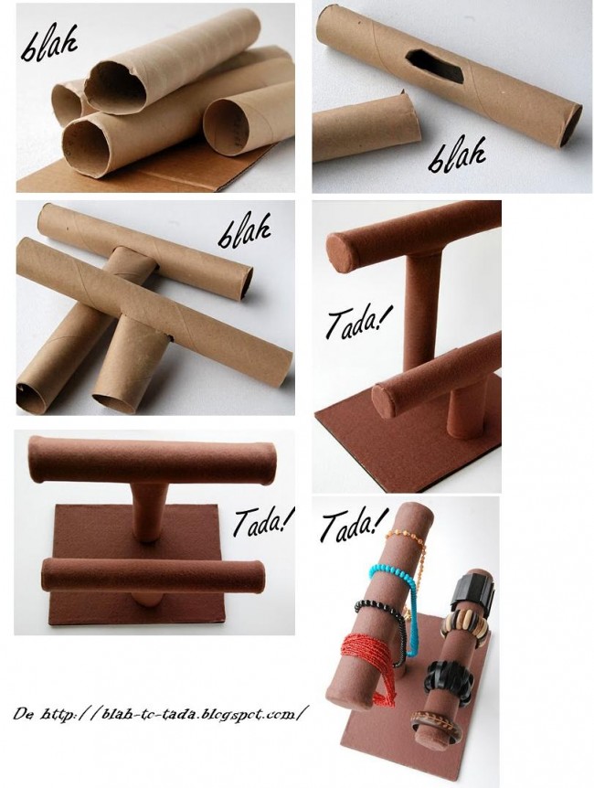 Une fois que c’est fait vous faites pareil avec les 2 petits rouleaux (ou un grand coupé en 2). Vous scotchez les petits aux grands pour former un T ou vous mettez un coup de pistolet à coller autour. Pour ma part j’ai préféré le pistolet (en plus du scotch) que je trouvais plus solide. Ensuite vous collez au pistolet à coller les T sur une planche de carton préalablement recouvert de papier décoratif. Normalement c’est plutôt solide. Pour ma part j’ai mis quasiment tous mes bracelets dessus et ça tient depuis 1 moi. Le seul truc c’est qu’il faut respecter l’équilibre histoire que les T ne penchent pas trop d’un coté ou de l’autre pour finalement se casser….