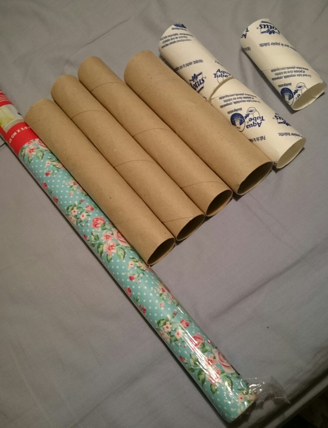 Vous rembourrez 2 rouleaux de sopalin de papier journal et vous recouvrez le tout de papier collant décoratif.