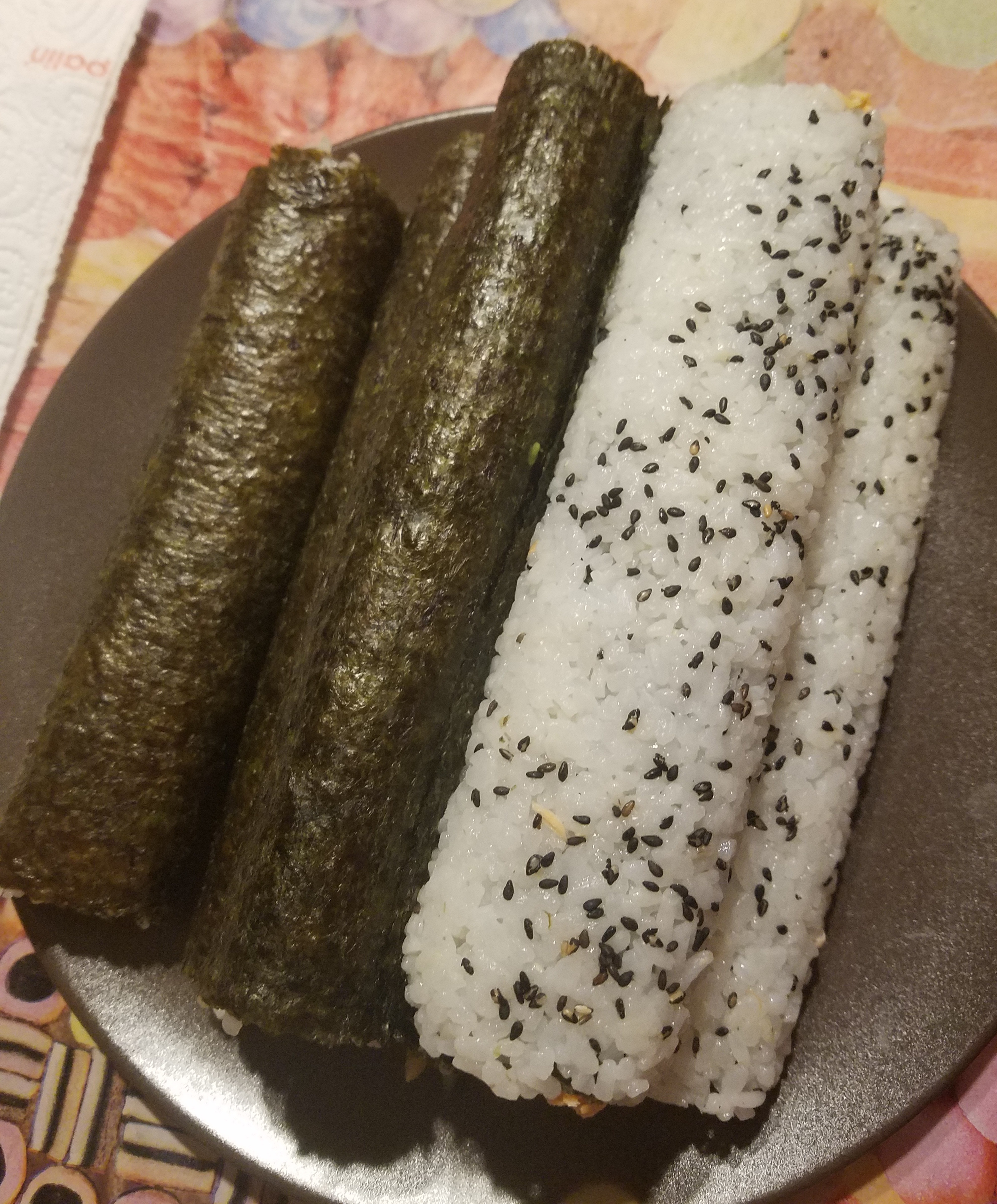 Je me suis également lancée dans des makis. En vrai, ça, je voulais en faire dès le debut de confinement mais les feuilles de Nori (algues) semblaient en rupture de stock dans mon commerce de proximité. Il a fallut attendre 3 ou 4 semaines. Pour cette recette, j’ai encore suivi la préparation du riz de la chaine, les recettes d’une japonaise mais j’ai retiré un peu de sucre. Habituellement je les fais au saumon frai mais vu la crise sanitaire j’ai préféré cuire le saumon. Du coup pour les ingrédients j’ai utilisé du saumon cuit à feu doux donc toujours mou que j’ai émietté (1 darne et demi je dirais), un demi concombre, 2 avocats et 10 feuilles de Nori. Ce qui m’a donné l’équivalent d’une 40aine de pièces une fois découpé.