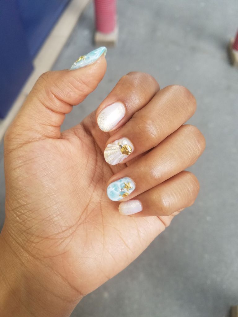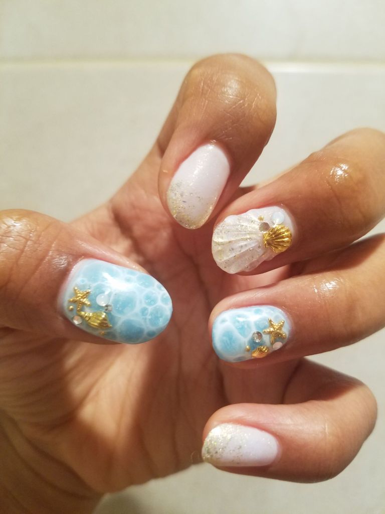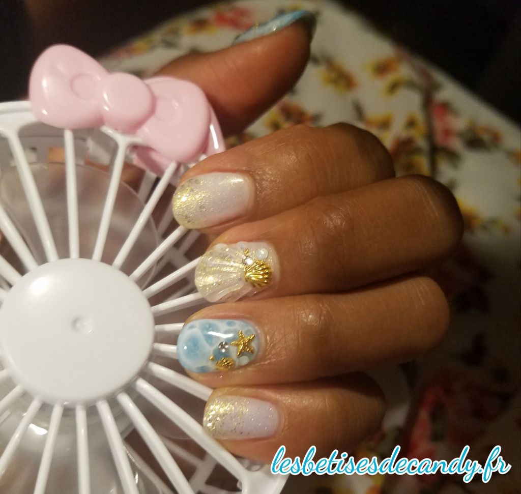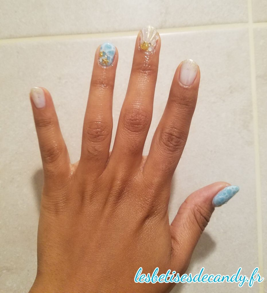 J’aime beaucoup l’effet vague/écume et l’ongle coquillages. C’est vraiment la première fois que je fais ça!