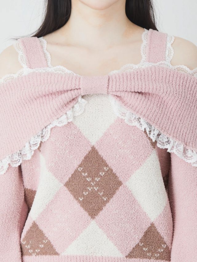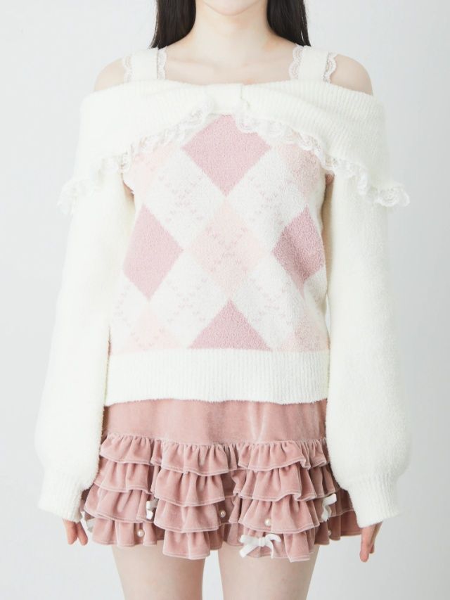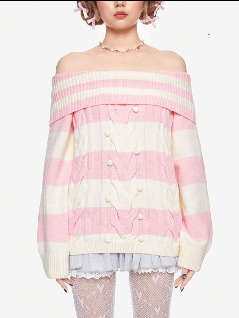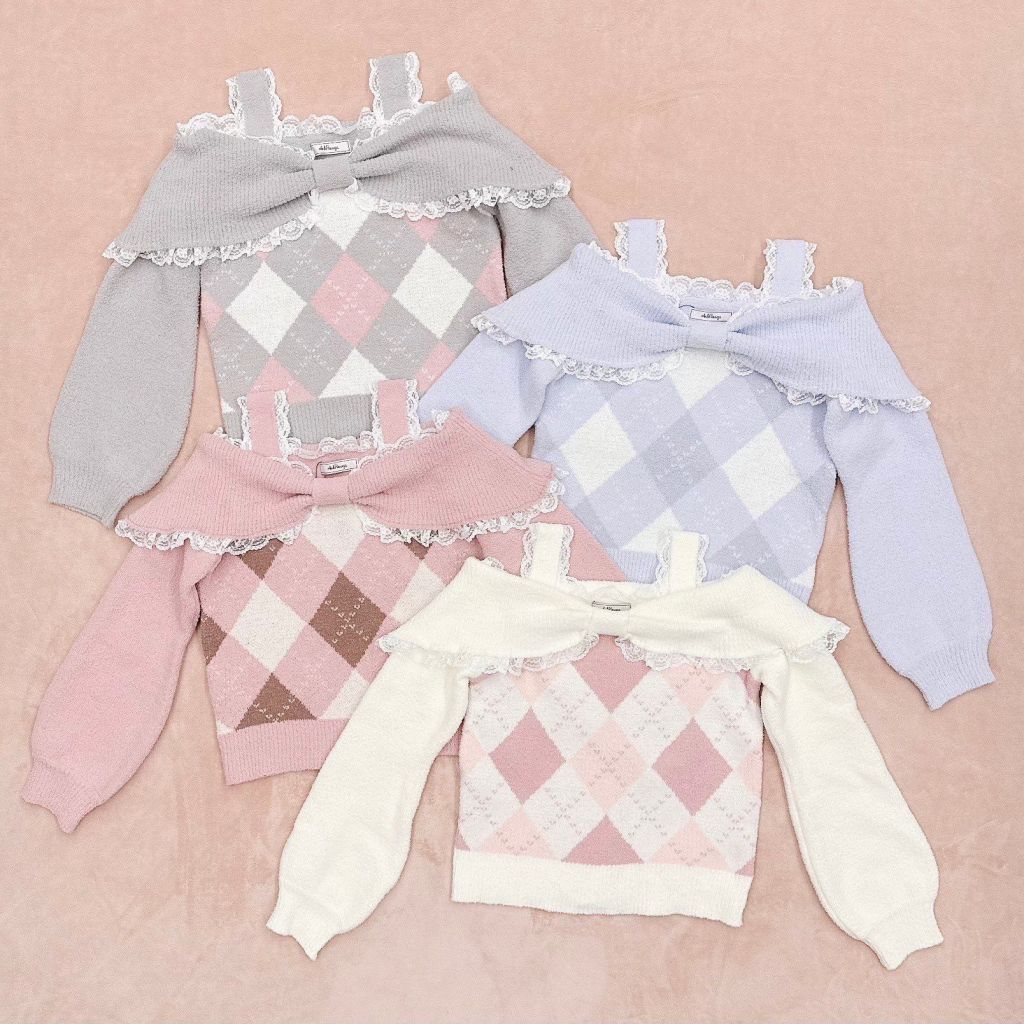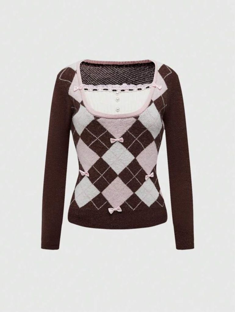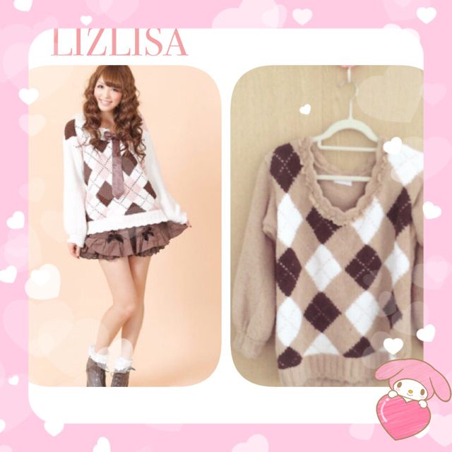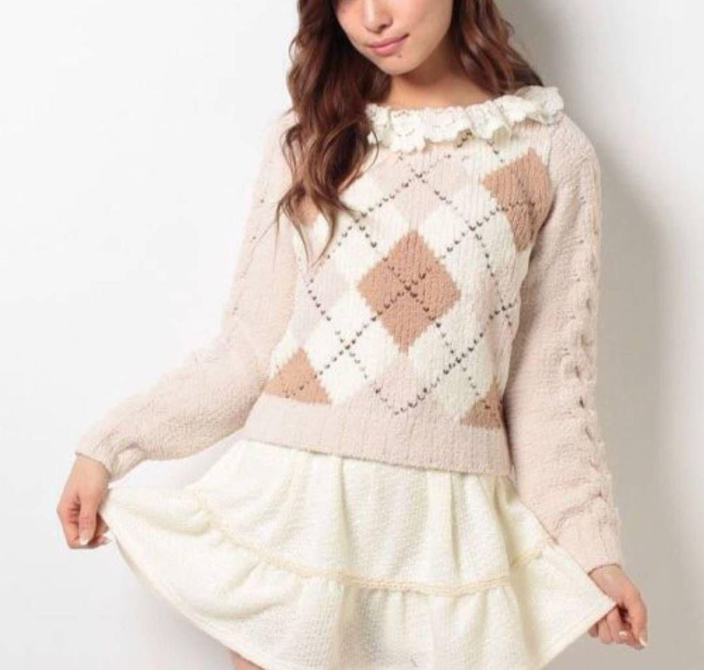Dans le même style Romwe a vendu un dupe de ce top de liz Lisa (aujourd’hui sold out). On voit quol reprend les même éléments (pull fluffy, motif losange, dentelle autour du col) mais c’est plus « grossier ».