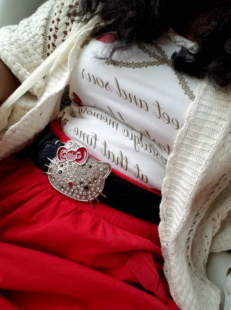 T-shirt: Ank rouge / Jupe : Camaieu / Ceinture HK / Chaussure : gemo / Chapeau, gilet, sac et accessoires de sac cinnamoroll : Liz Lisa