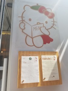 Niveau menu, il y avait le choix entre un Kitty Morning composé d’un kitty latte, un granola maison avec des écorces de yuzu (yummy!) et de yaourt,un donut matcha et chocolat blanc, un salade de fruit et un jus d’orange; et le Kitty Brunch composé d’un kitty latte, jus d’orange, pancake au matcha et chantilly matcha, une salade de fruit, un sandwich au poulet pané, du coleslow et une salade maraichère et chèvre frais au sésame et yuzu.