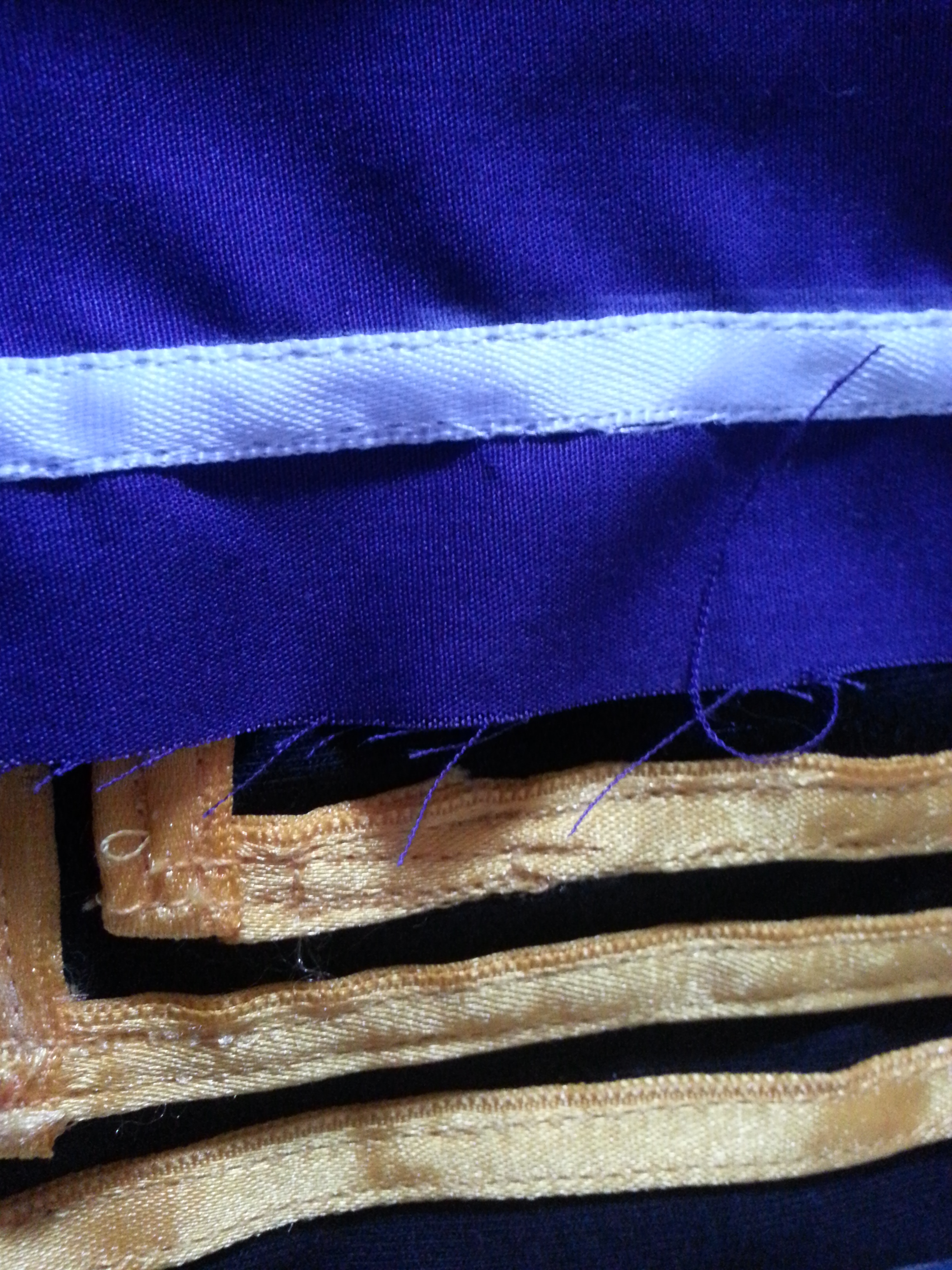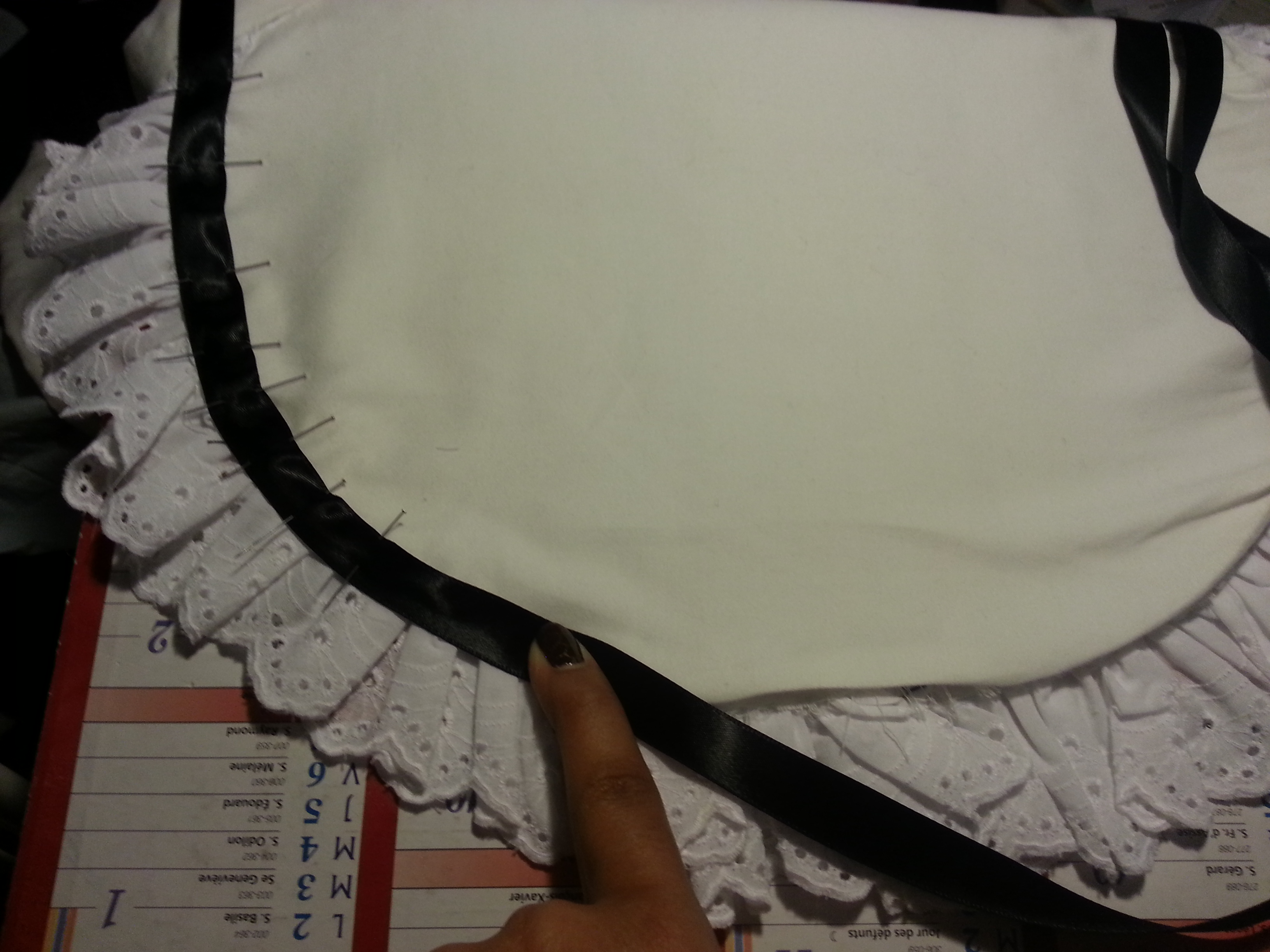 Miracle, j’ai cousu droit XDDD Bon en même temps l’autre c’était une bande de satin pliée en deux, d’où le fait d’acheter des bandes de la bonne taille et non pas de plié une plus grande! Puis tracé un joli traie à la craie c’est mieux pour avoir un truc plus droit. Puis pour le reste ce n’est pas spécialement mieux…
