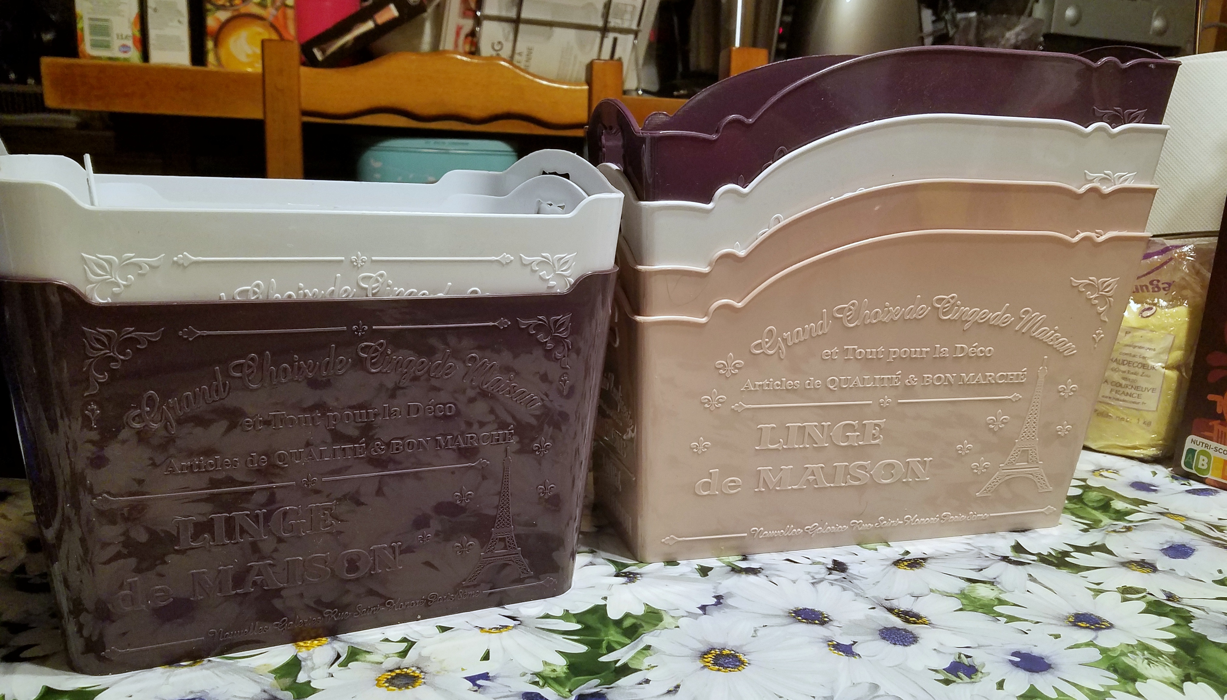 Last weekend, I go at my parent house and their favorite shop « Noz ». I found some Daiso inspirate boxes. You know « Maison Clement »? Now it’s « Linge de maison ». There are only white and purple and some pink items so I take more white and purple items. I feel so happy to find these boxes.