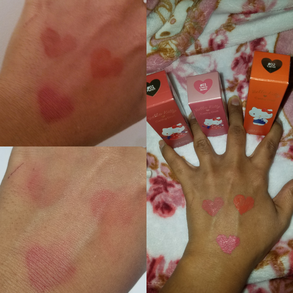 As I fear about blush on my color, I only take lipsticks. I choose 2 mat gloss #02 Carrot (orange), #03 Punch (brick color) and one glowing lipstick #01 Cherry bomb (more purple pink)