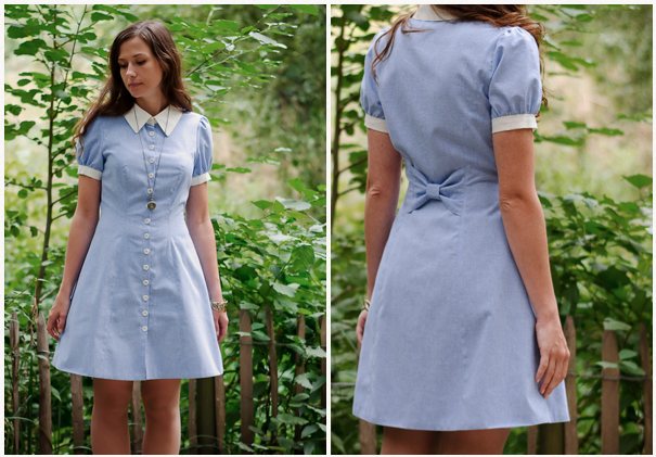 C’est mon gros coup de coeur du moment. –Moi et les fringues...- Ce qui m’a plus c’est la coupe qui est à la fois simple et jolie et les petits détails comme le noeud derrnier trop mignon, les manches ballons et le col! Sur le blog de la créatrice du patron, Éléonore Klein, on peut découvrir un exemple qui est juste magnifique! Du moins je trouve la couleur est bien choisie. Ça donne un petit coté sage et mignon!