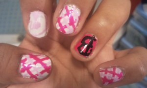 On ne dirait pas mais c’est assez complexe. La base est une dégradé de rose et violet, par dessus elle a mis différentes paillettes puis un autre vernis à paillettes puis elle a collé les bijoux.